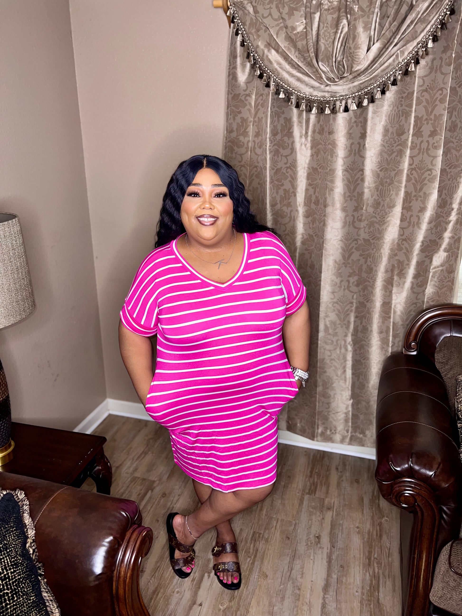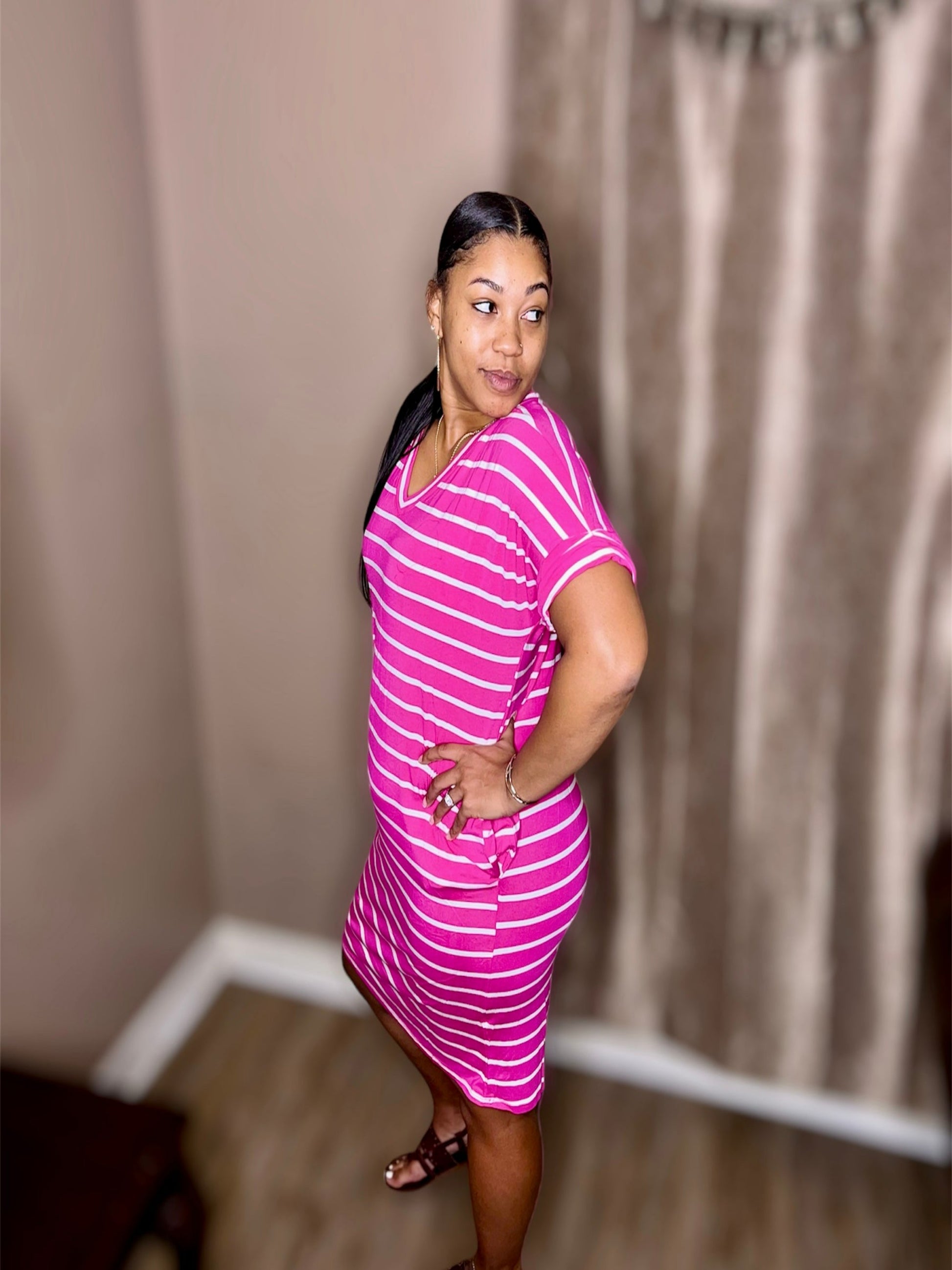 Pink Stripe Rolled Short Sleeve V-Neck Dress (Regular & Kurvy)