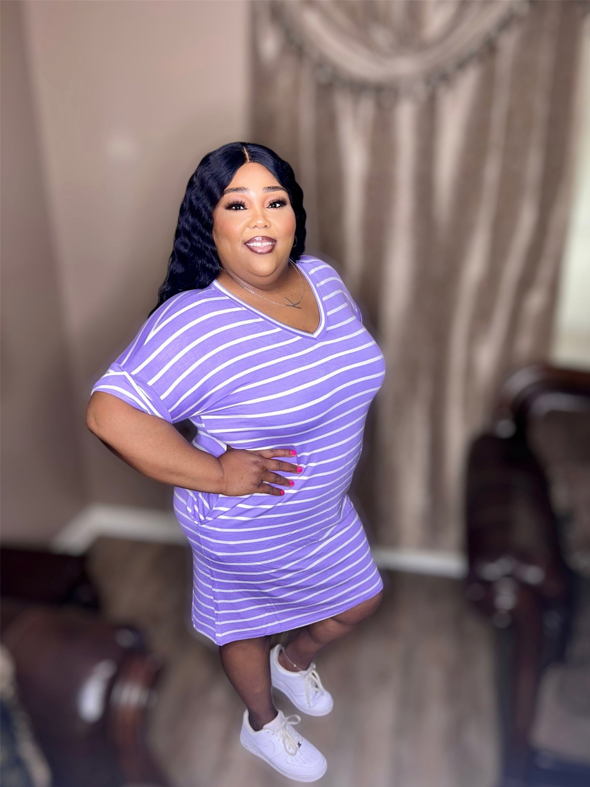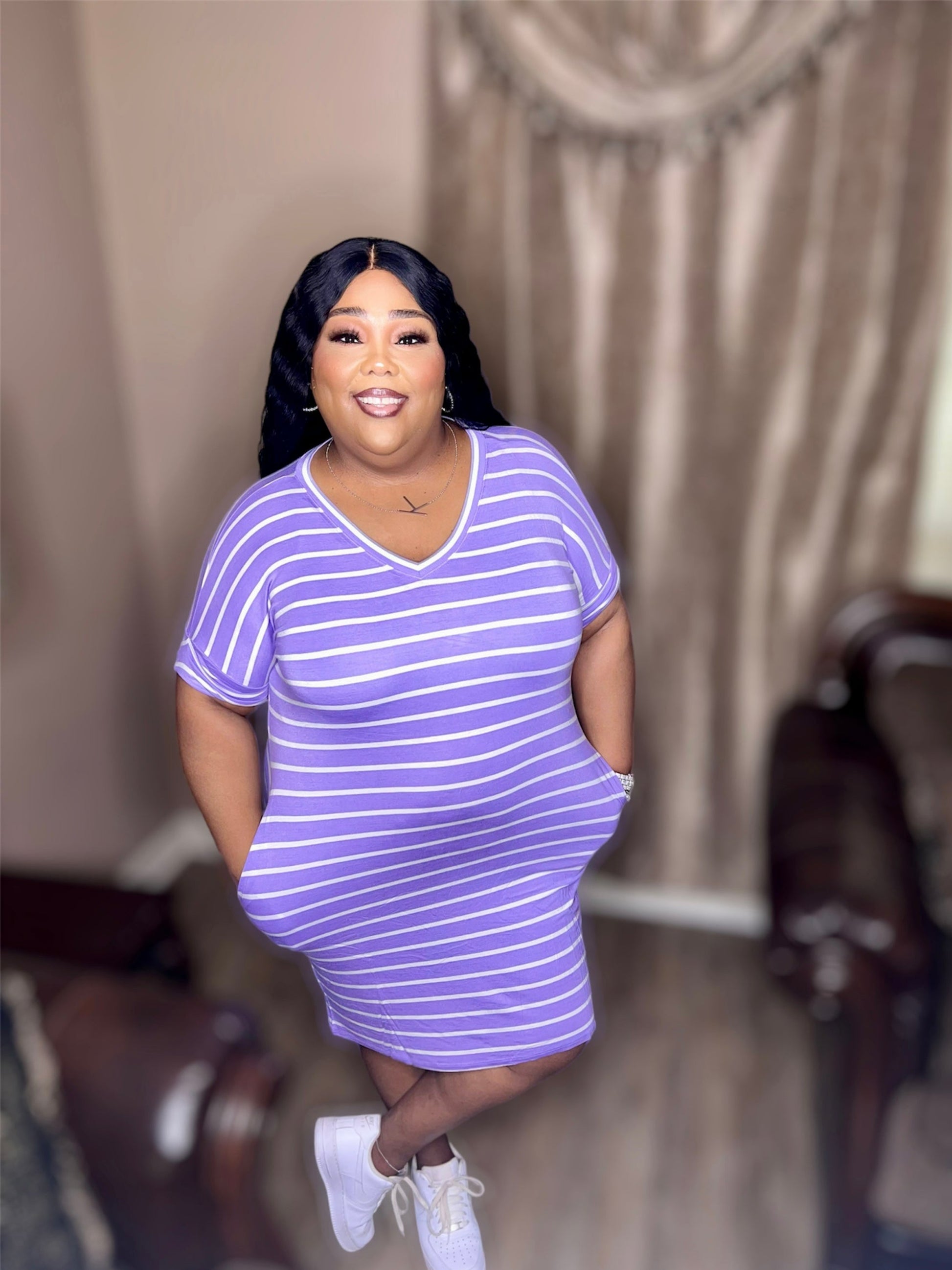 Lavendar Stripe Rolled Short Sleeve V-Neck Dress (Regular & Kurvy)